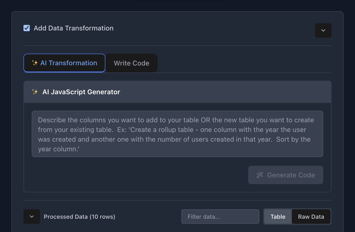 Describe the transformation you need — AI writes the code.
